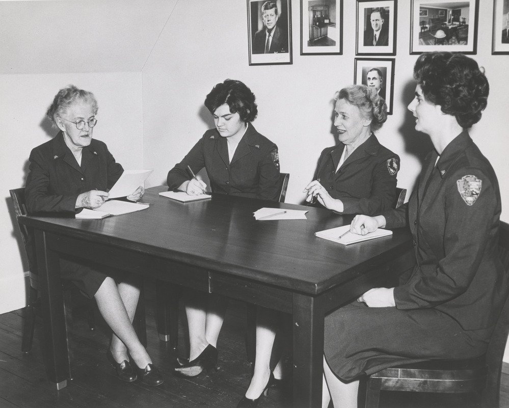 Possibly an NPS uniform committee meeting. From left to right: Adams National Historical Site Superintendent Wilhelmina Harris; Marianne Potts; Anne E. Boyes; Helen L. Nelson. The women all wear the 1961 women's uniform .