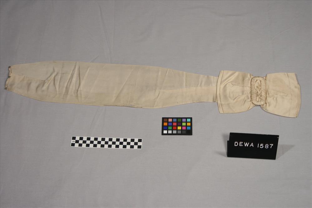 Ivory colored satin ribbon belt, closes with snaps, covered buckle with bow