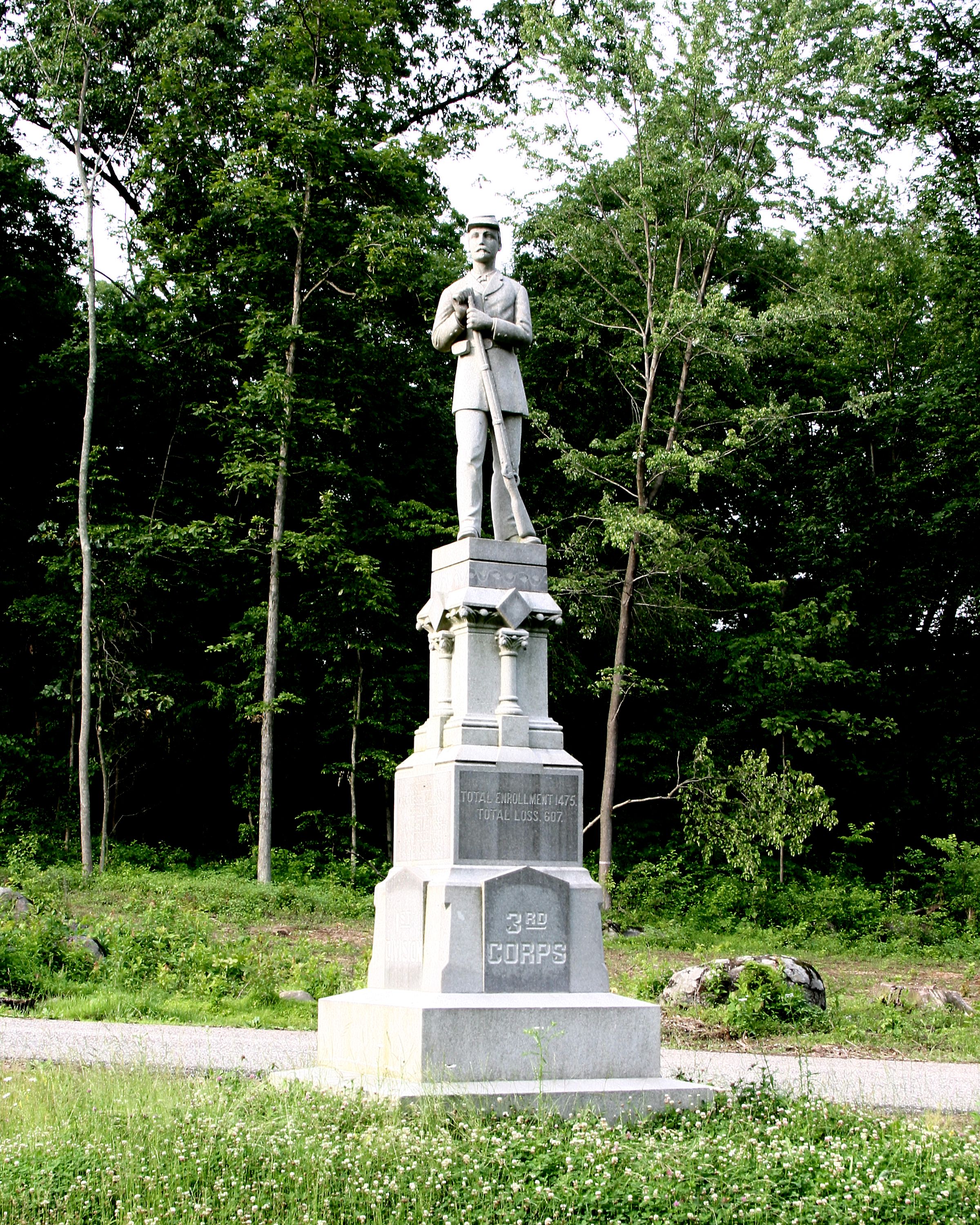 1 of 110 mns in Park to Pennsylvania troops in Gettysburg campaign. Marks position held by the 110 Pennsylvania on July 2, 1863 when it successfully halted the advance of CS through the woods. Located on SE side of DeTrobriand Ave near Rose Woods. || Mn & 2 flank markers. Double base, 5'6" sq., 3 layered shaft, 2'10" sq. topped w/ statue of infantryman. All 13'6" high. Polished panels w/ inscriptions, all sides. 4 pilasters on shaft. Flank markers, Flat top w/ raised inscription on top.1'x1'x1'6"