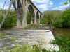 A view looking east of the excavator notching the Brecksville Diversion Dam. The massive concrete arches of the Brecksville-Northfield bridge rise on the left. The calm pool above the dam contrasts with the whitewater below.