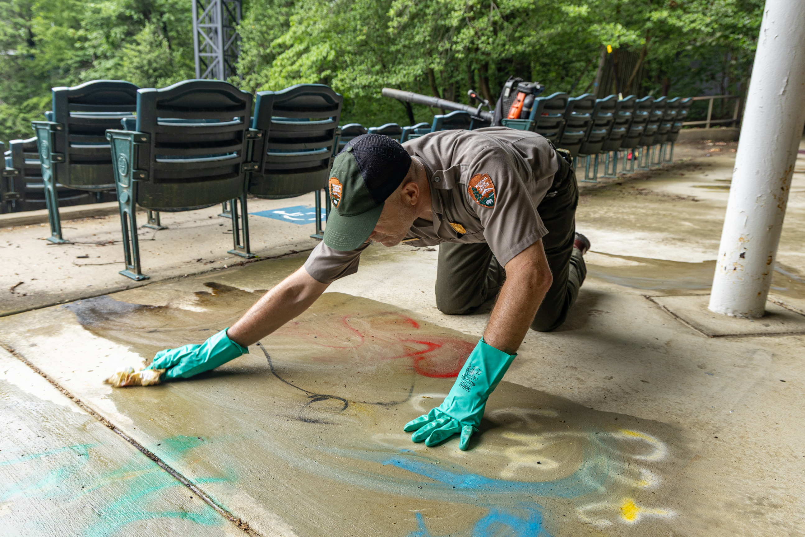 Park Ranger Nick Bartolomeo removes graffiti at Carter Barron Amphitheater in Washington, D.C., June 17, 2025.