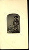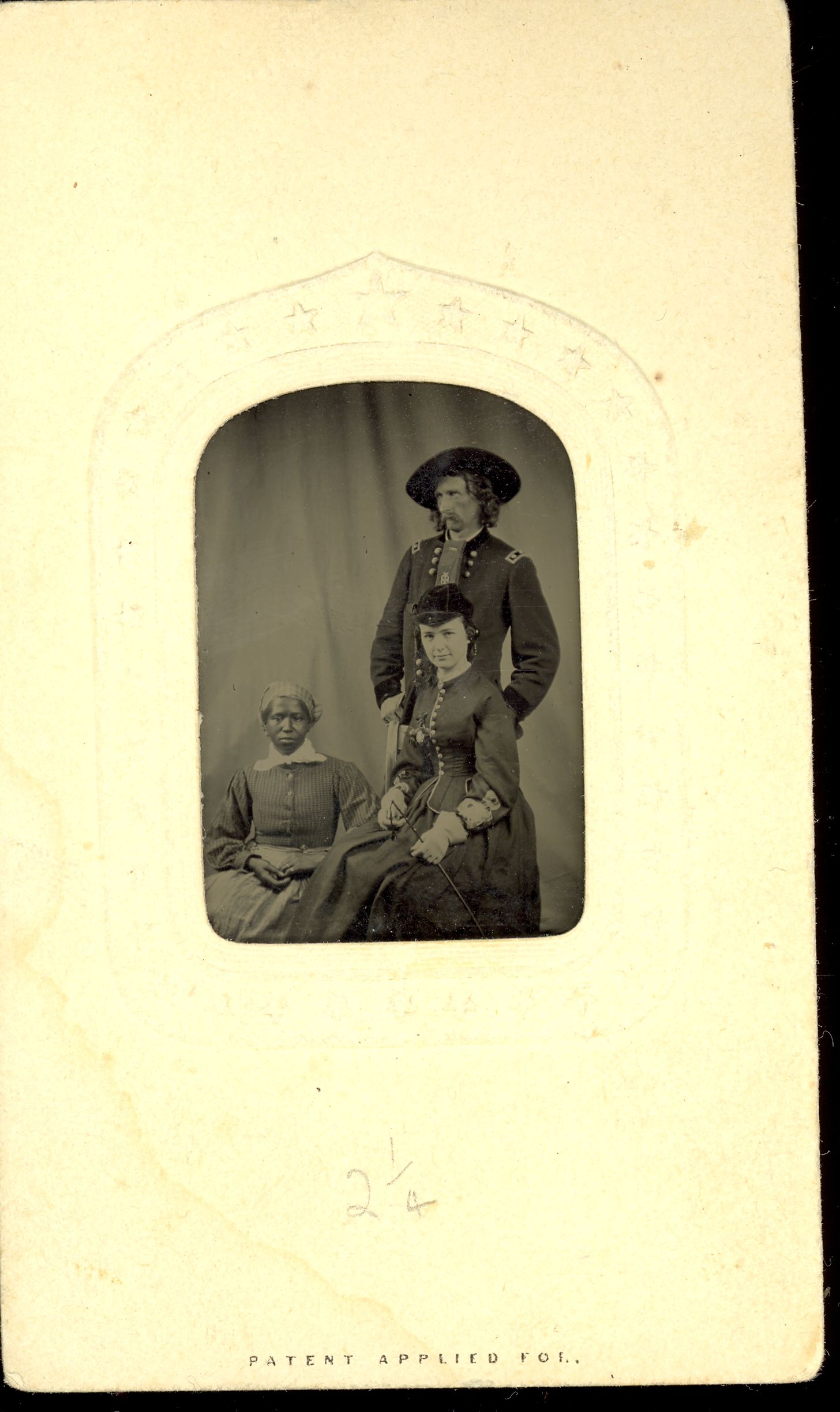 LIBI_00019_00562; This item is an original tintype (direct positive on iron support) of George A. Custer, Elizabeth B. Custer and Eliza, the Custer's personal servant. The full view tintype is 2 1/4 x 1 1/4" (2 3/8 x 4" mounted in original paper enclosure). Paper envelope is embossed with stars. As noted on page 53 of D. Mark Katz's book, the image was produced circa 1865 and is attributed to William Frank Browne.Note: "Pkg 7" handwritten on the verso. Photograph reprinted in "Custer in Photographs" by D. Mark Katz, page 53.; Tintype [photograph]; Courtesy of the National Park Service, Little Bighorn Battlefield National Monument, LIBI_00019_00562, William Frank Browne, "George Armstrong Custer in Military Uniform and Hat with Long Hair, standing Behind Elizabeth Bacon Custer with an African American Servant," circa 1865