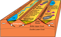 National Park Service sites in continental rift zones reveal long mountain ranges separated by deep valleys (basins) that are partially filled with sedimentary and volcanic material. Earthquakes (white stars) occur when the fault lines separating the basins and ranges suddenly let go.
