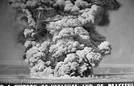 A black and white image of a large smoke plume rising from a flat landscape. The smoke plume emerges from the ground in the center of the image. It expands as it reaches the sky. The smoke is a light gray towards the ground and becomes a darker gray with dark shadows as it rises. The smoke plume has various grooves, curves, and swirls to dramatize the shape of the smoke. In the background there are mountains. Along the bottom of the image there is an exhibit label peeking out. It reads, "A History of Violence and of Peaceful."