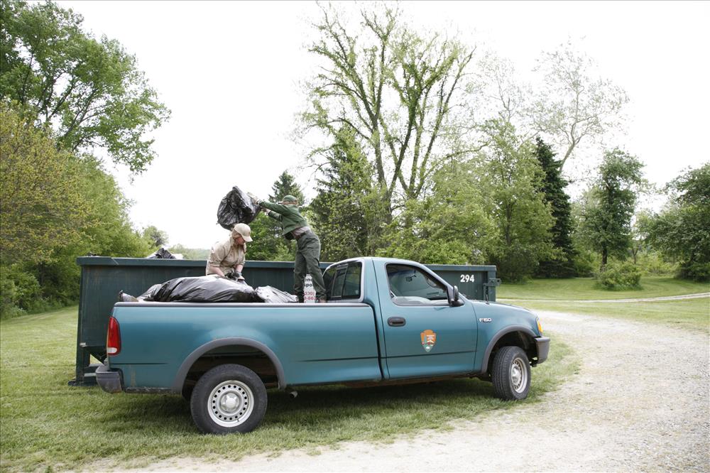 An SCA intern and NPS Botanist Laura Elze dispose of bags of invasive plants at River Day 2007 || Invasive plants are exotic species that tend to crow out native plants. Cuyahoga Valley National Park (CVNP) controls invasive plants when their presence menaces natural conditions. Volunteers hand pull small, easily controllable populations.