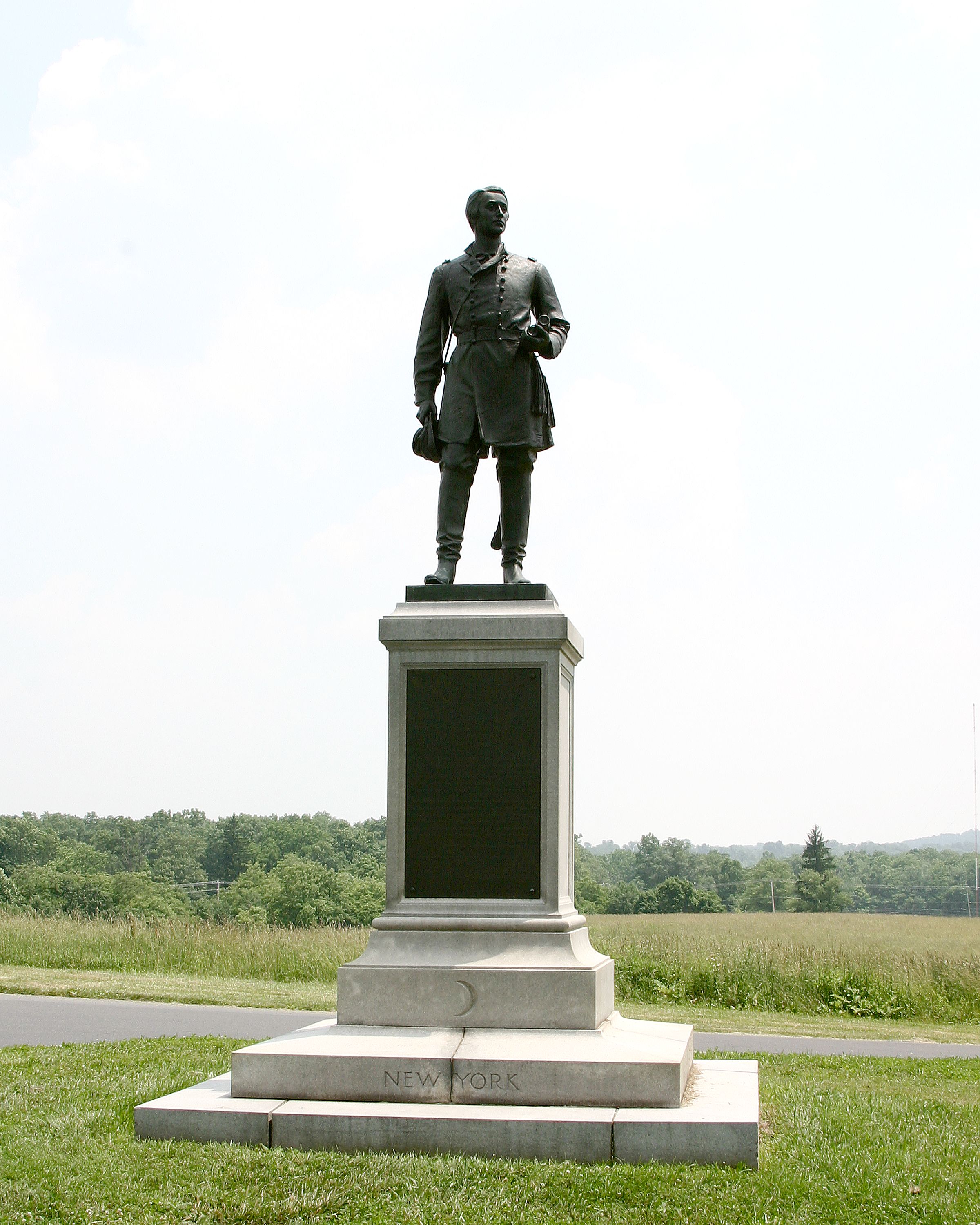 1 of 15 statues to officers. Located in vicinity where Brig. Gen. BArlow's RF was assailed & forced back to Alms House. Rallied his command, then was seriously wounded. || Mn: 10'4" sq fnd base, w/ stepped pedestal base to granite shaft. bronze tablet obverse, medallion reverse. Topped w/ statue of Gen. Barlow. Total Height: 18'-7". Incised inscription in base.