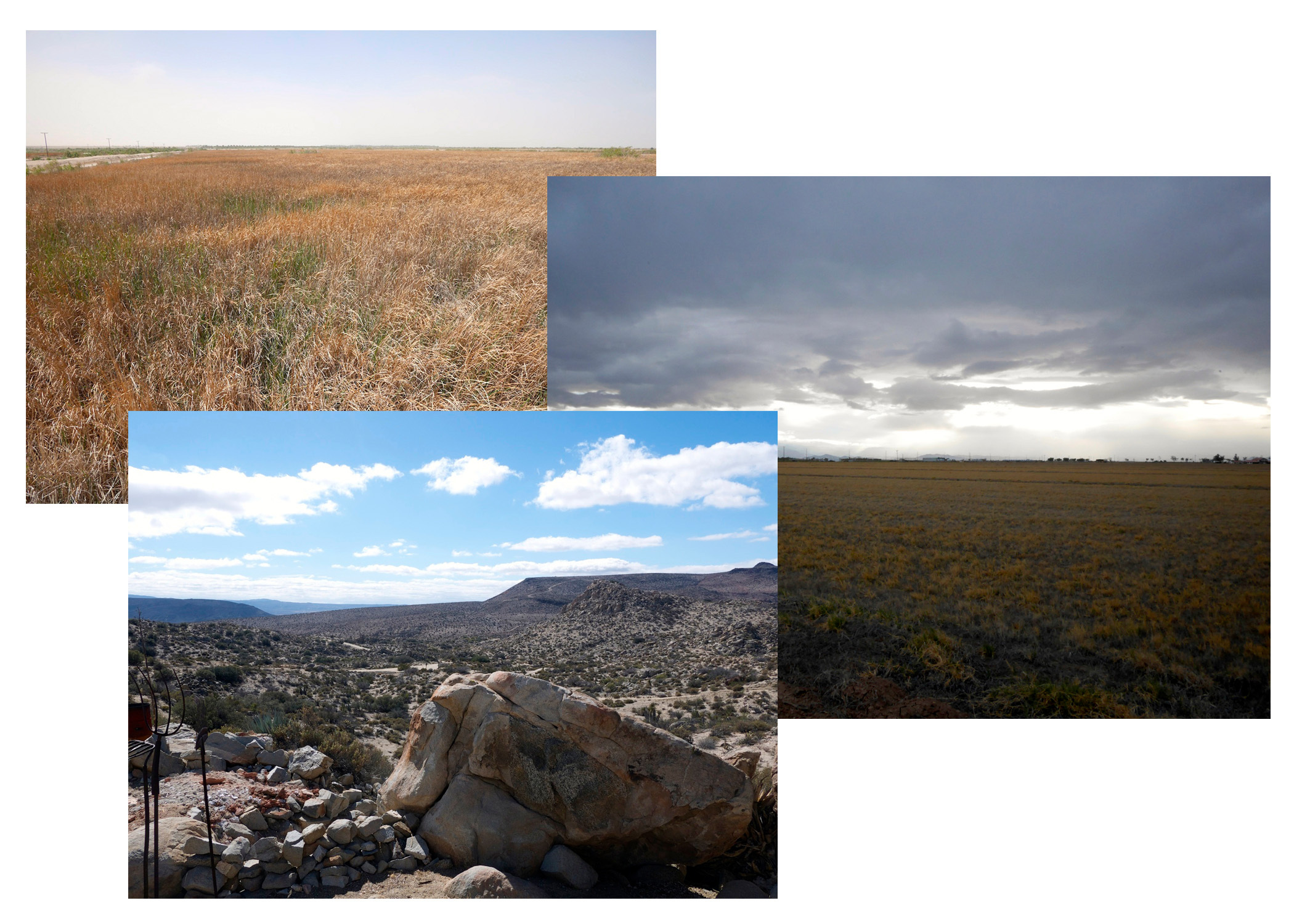 Three photos of a field of dry grass with some patches of green, a field with small tufts of grass under a gray sky, and a large boulder next to a pile of rocks and metal farm tools stood upright above a desert valley