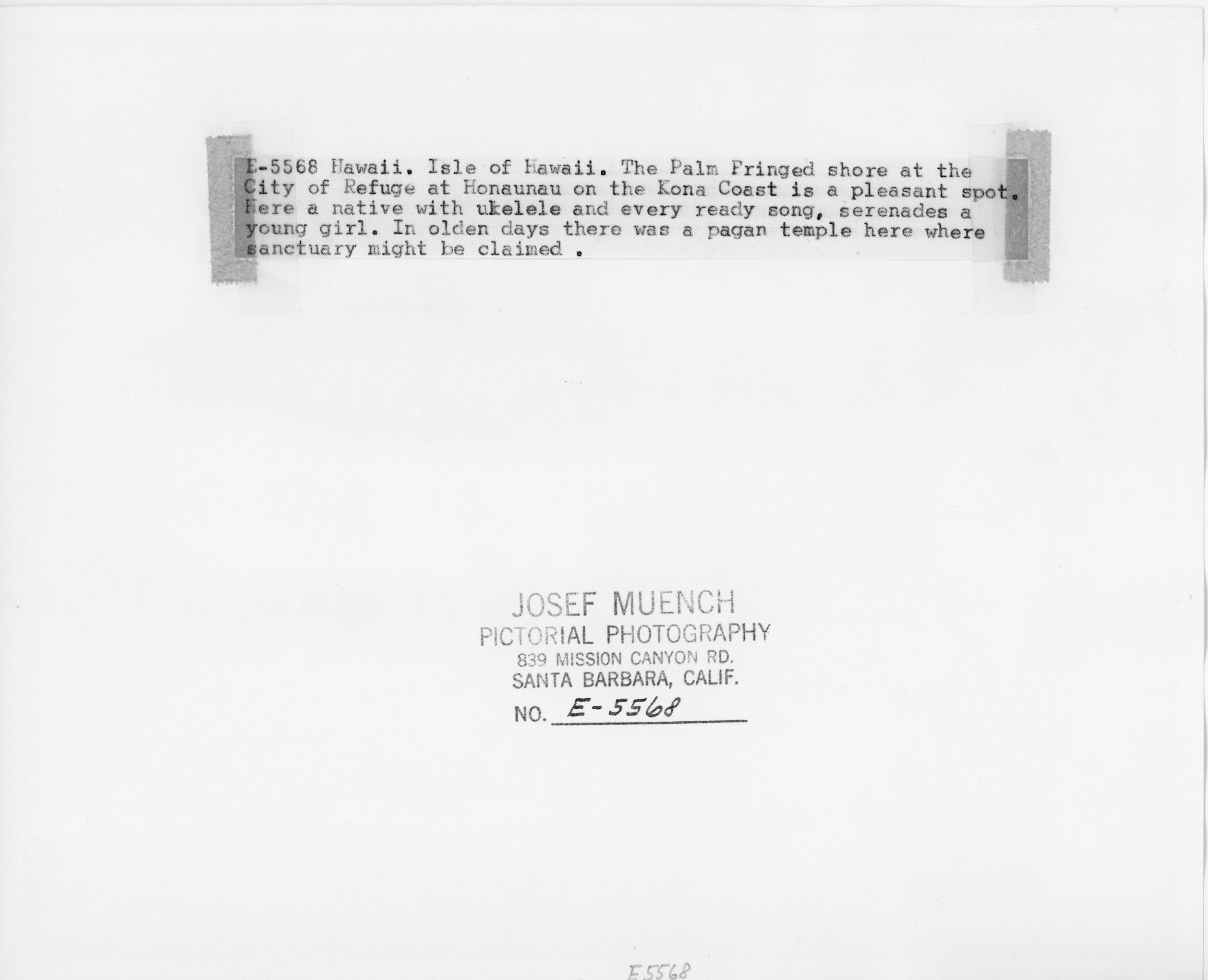 The back of an image with a woman and man between palm trees at the beach. There is text on the back of the image that reads, “E-5568 Hawaii. Isle of Hawaii. The Palm Fringed shore at the City of Refuge at Honaunau on the Kona Coast is a pleasant spot. Here a native with ukulele and every ready song, serenades a young girl. In olden days there was a pagan temple here where sanctuary might be claimed.” At the bottom, it has the photographer's name, “Josef Muench,” where the image was produced, “Pictorial Photography, 839 Mission Canyon Road. Santa Barbara, California," and the number assigned to the image, "E-5568."