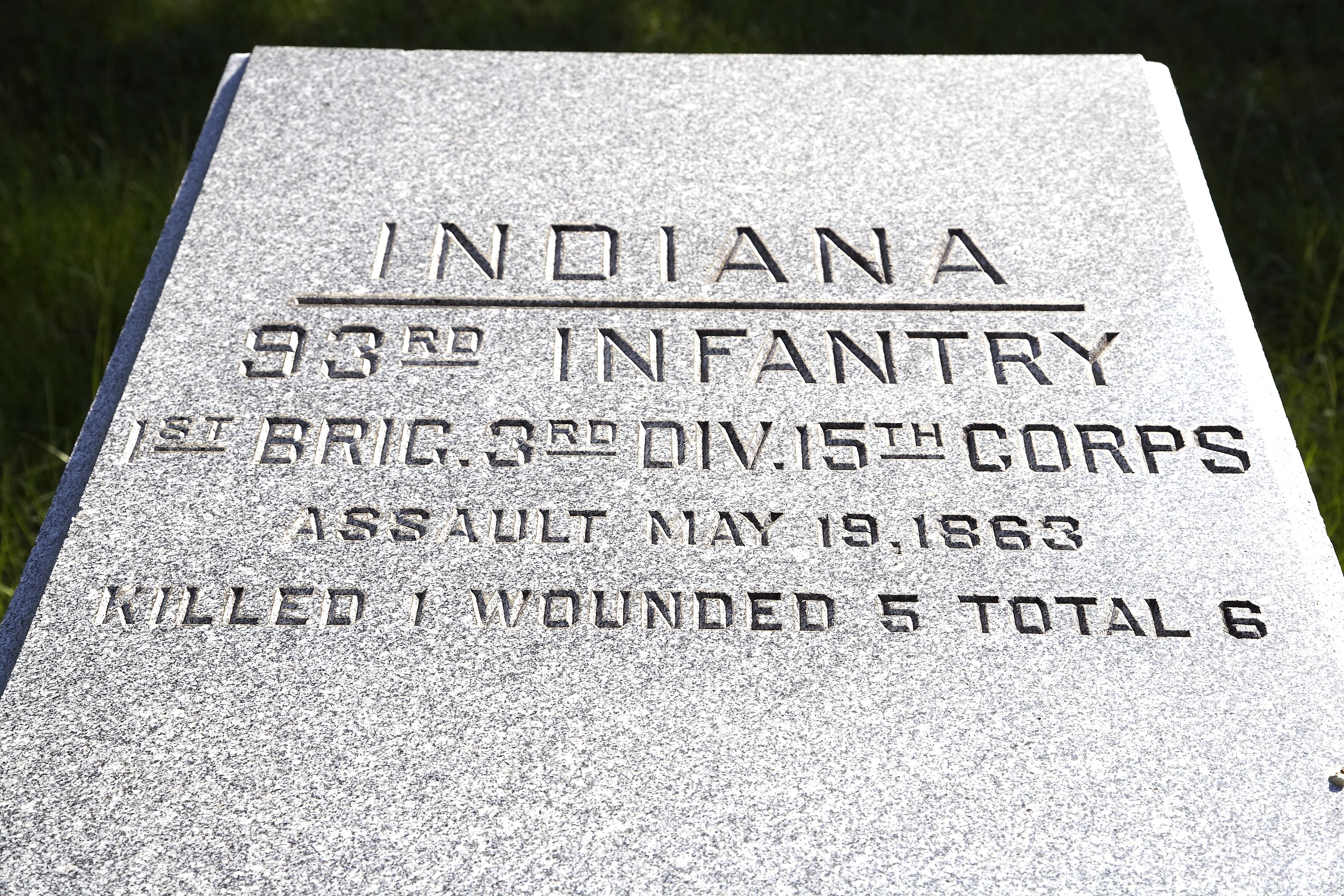 30" x 45" x 40" high, rectangular, hammer-finished gray granite block, inscribed on its slightly slanted top with INDIANA and unit designation. Edges of top are beveled.