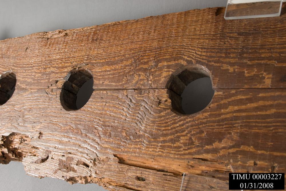 2 boards, each with 6 half circular holes cut in 1 side which when put together form 6 circular openings for legs of 3 prisoners. Boards hinged on 1 end using 3 sets nuts, bolts, washers fastened through 2 pieces wood, 1 on each side of boards. Top board swivels on these fasteners. 2 additional sets located on bottom side of bottom board. On end opposite hinge is ring on bottom board through which chain was threaded. Ring on top board & chain missing. Stocks sit on 2 rectangular blocks wood with notches cut in top. Believed used to punish Kingsley Plantation slaves, though this not verified.