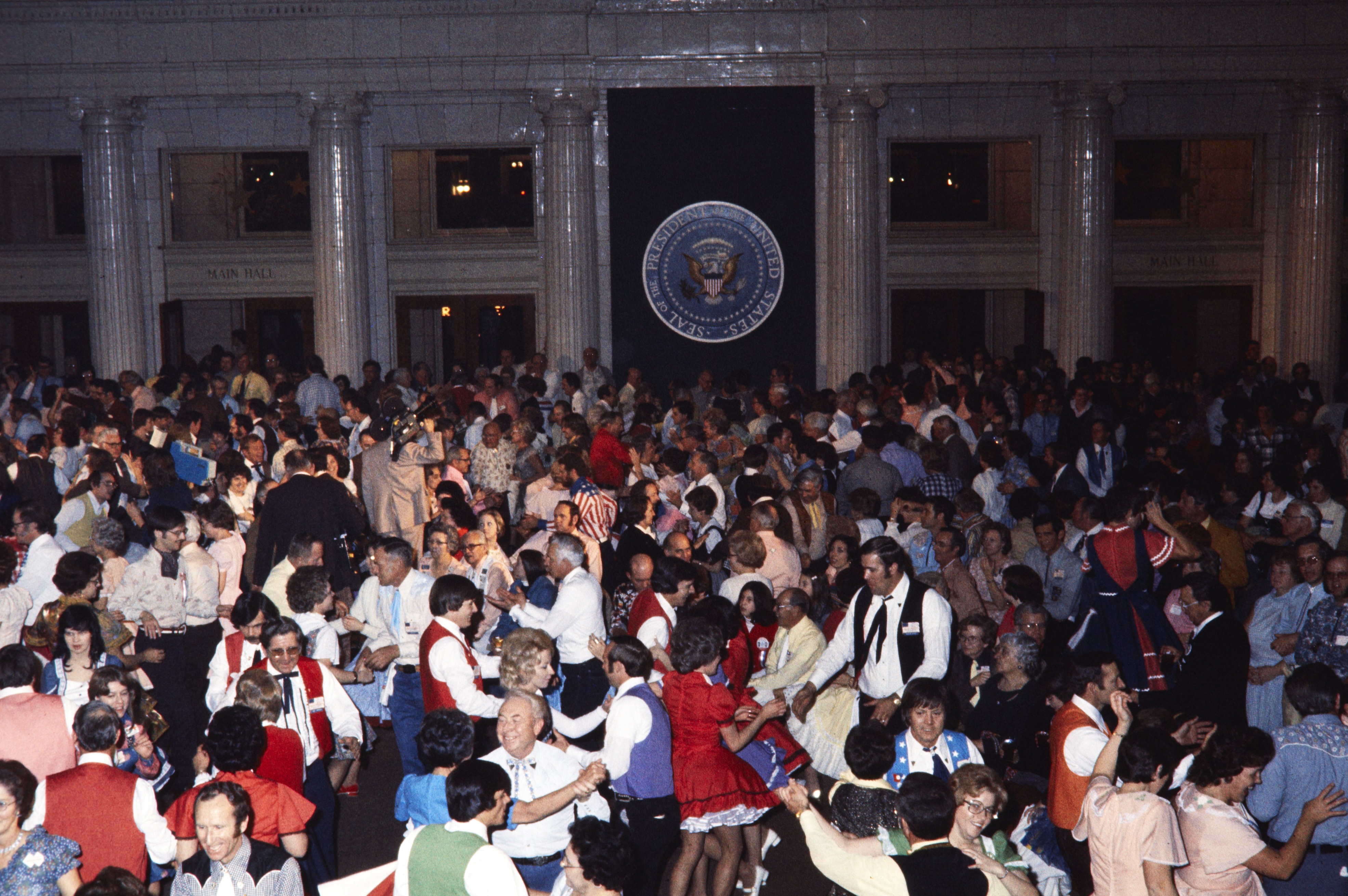 Room filled with dancing people under the Seal of the President of the Unted States.