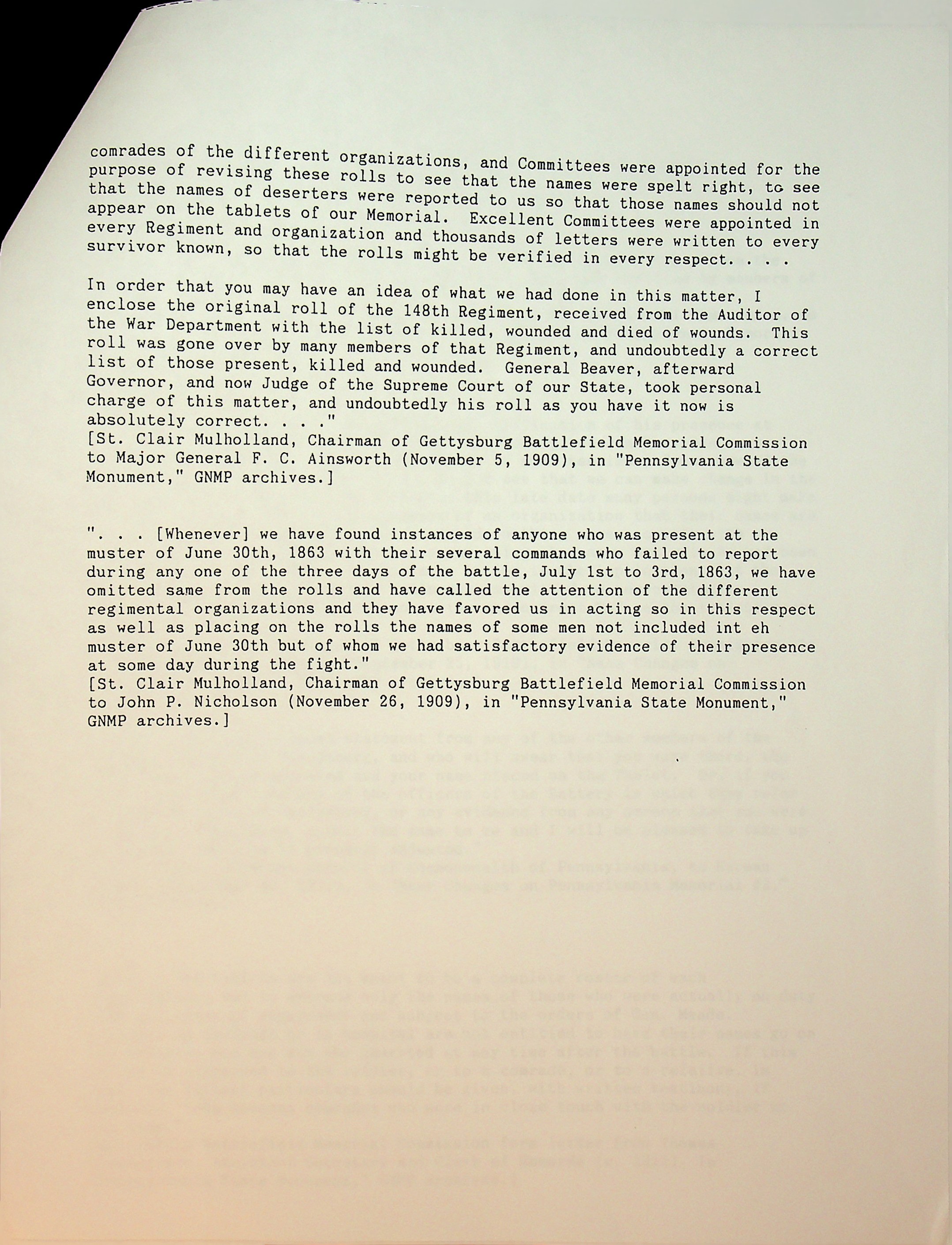 “…[Whenever] we have found instances of anyone who was present at the muster of June 30th, 1863 with their several commands who failed to report during any one of the three days of the battle, July 1st to 3rd, 1863, we have omitted same form the rolls and have called the attention of the different regimental organizations and they have favored us in acting so in this respect as well as placing on the rolls the names of some men not included in the muster of June 30th but of whom we had satisfactory evidence of their presence at some fay during the fight.”