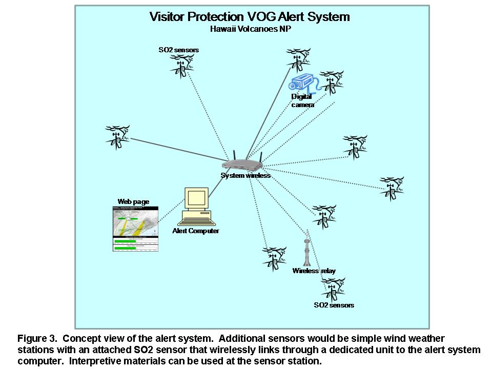 Update SO2 monitoring system in Hawaii Volcanoes NP. Map of curren and proposed monitoring stations, photo of VOG plume and Diagram of alert system
