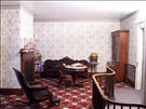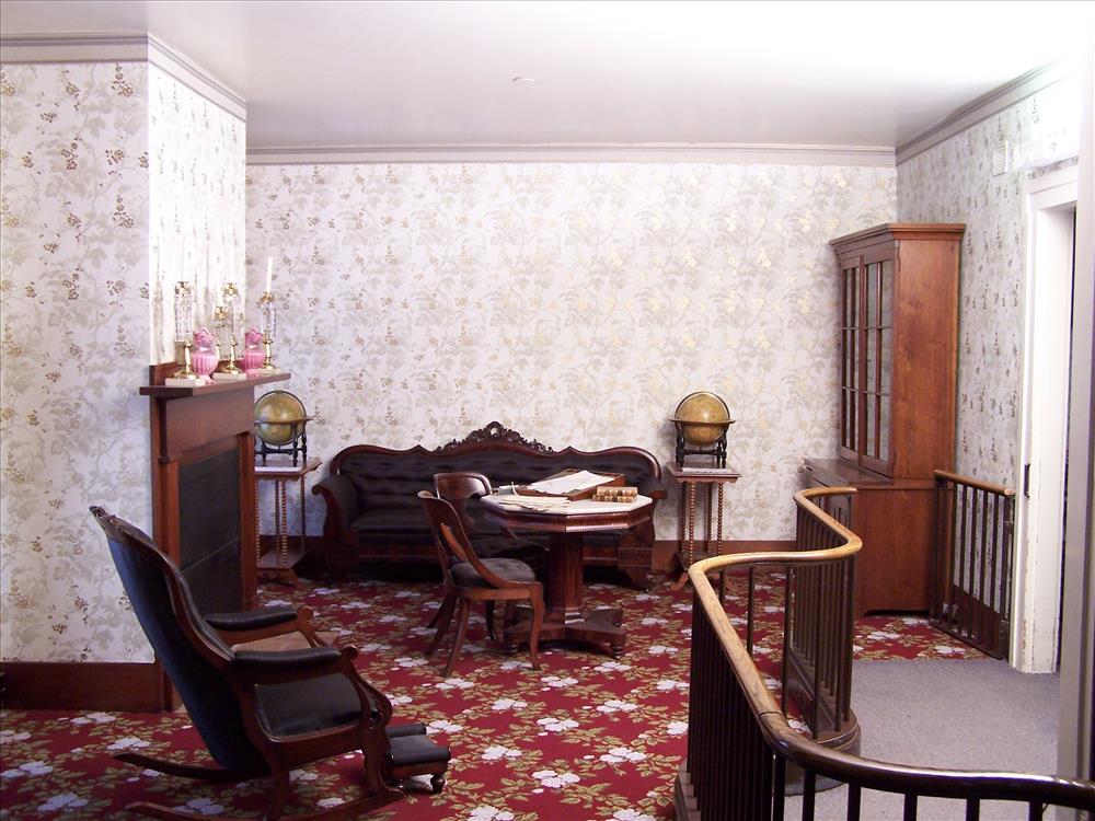Images from the interior of the Lincoln Home. The wallpaper, carpeting, and draperies are reproductions of period patterns. Artifacts in the photos - furniture, dinnerware, knick-knacks, etc. - are largely period pieces, with only a handful of reproductions.
