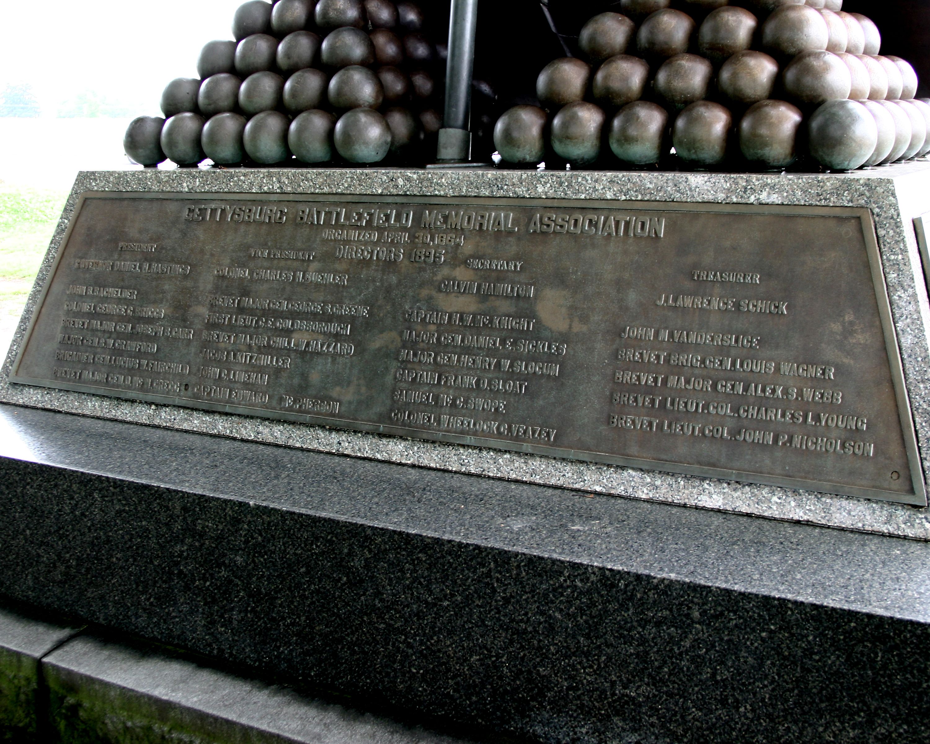 1 of 6 National monuments, second oldest. Commerates both Union and Confederate forces that fought at Gettysburg. Represents the turning point of the rebellion. Located at the Copse of Trees West of North Hancock. || Combined w/Mn 389. Mn base 11'4"sq, rough hewn. Shaft of polished granite, topped w/ oversize open bronze book. Tablets 4 sides w/ rear tablet added 1895 (MN389) listing directors of Gettysburg Battlefield Memorial Association. All 9'H.