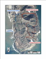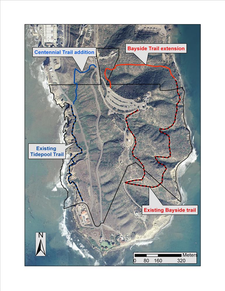 Two proposed trails (Bayside extension and Centennial) are shown along with the existing trails at Cabrillo NM.