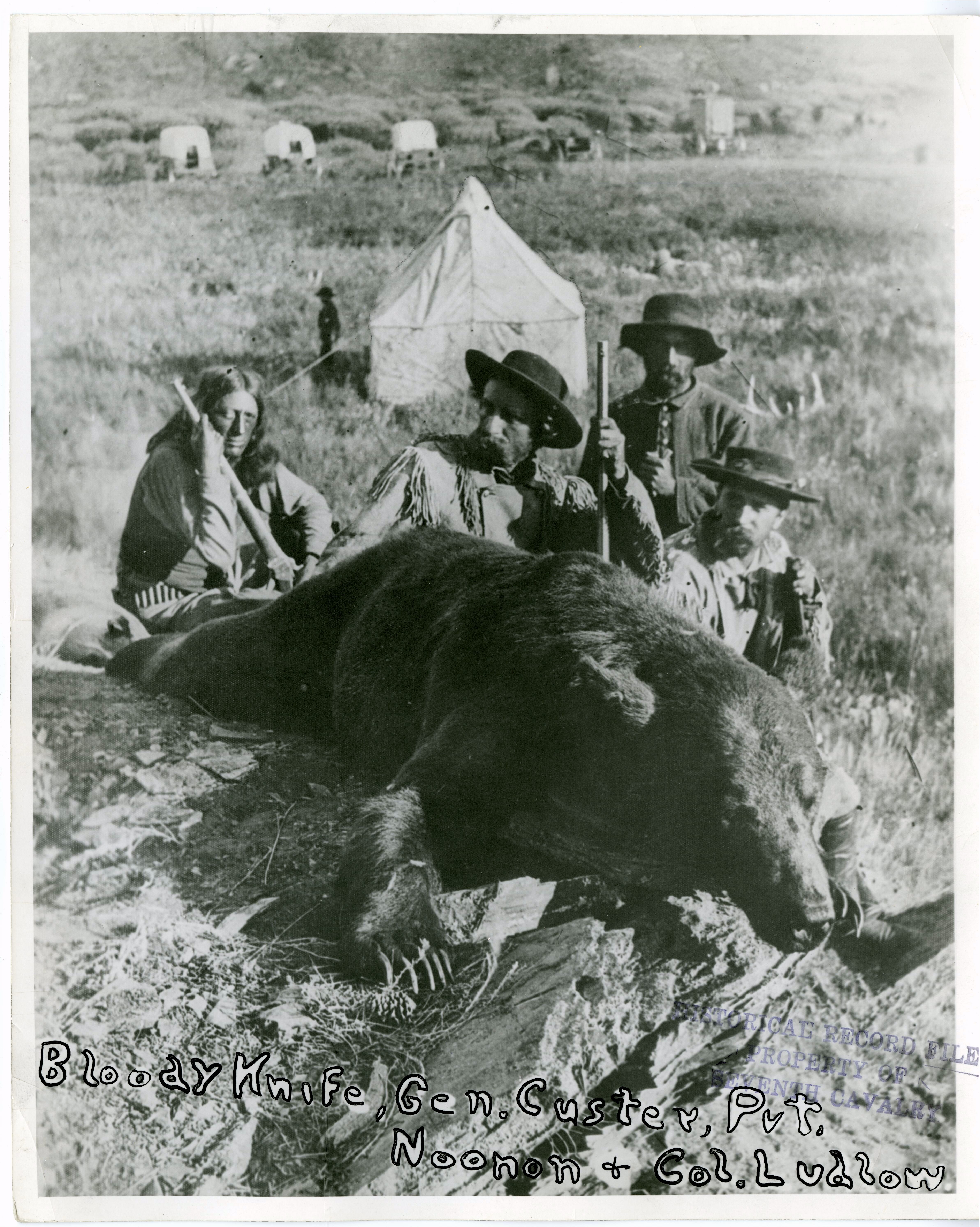 Courtesy of the National Park Service, Little Bighorn Battlefield National Monument, LIBI_00011_07099, W H. Illingworth, "Grizzly Bear Hunt—Bloody Knife, General George Armstrong Custer, Colonel William Ludlow, and Private John Noonan," 1874