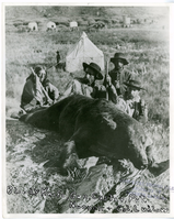 LIBI_00011_07099; A black-and-white photograph (reproduction print) depicting General Custer and the hunting party that killed a grizzly bear - first grizzly Custer had ever killed; "Bloody Knife, Gen. Custer, Pvt. Noonon and Col. Ludlom" notation is apparent on print; originally photographed in 1874, by William H. Illingworth.; PRINT, PHOTOGRAPHIC; Courtesy of the National Park Service, Little Bighorn Battlefield National Monument, LIBI_00011_07099, W. H. Illingworth, "Grizzly Bear Hunt—Bloody Knife, General George Armstrong Custer, Colonel William Ludlow, and Private John Noonan," 1874