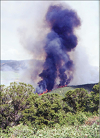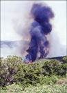 Intense burning with heavy gray and black smoke and flames during the Bircher fire, Mesa Verde National Park, July 2000