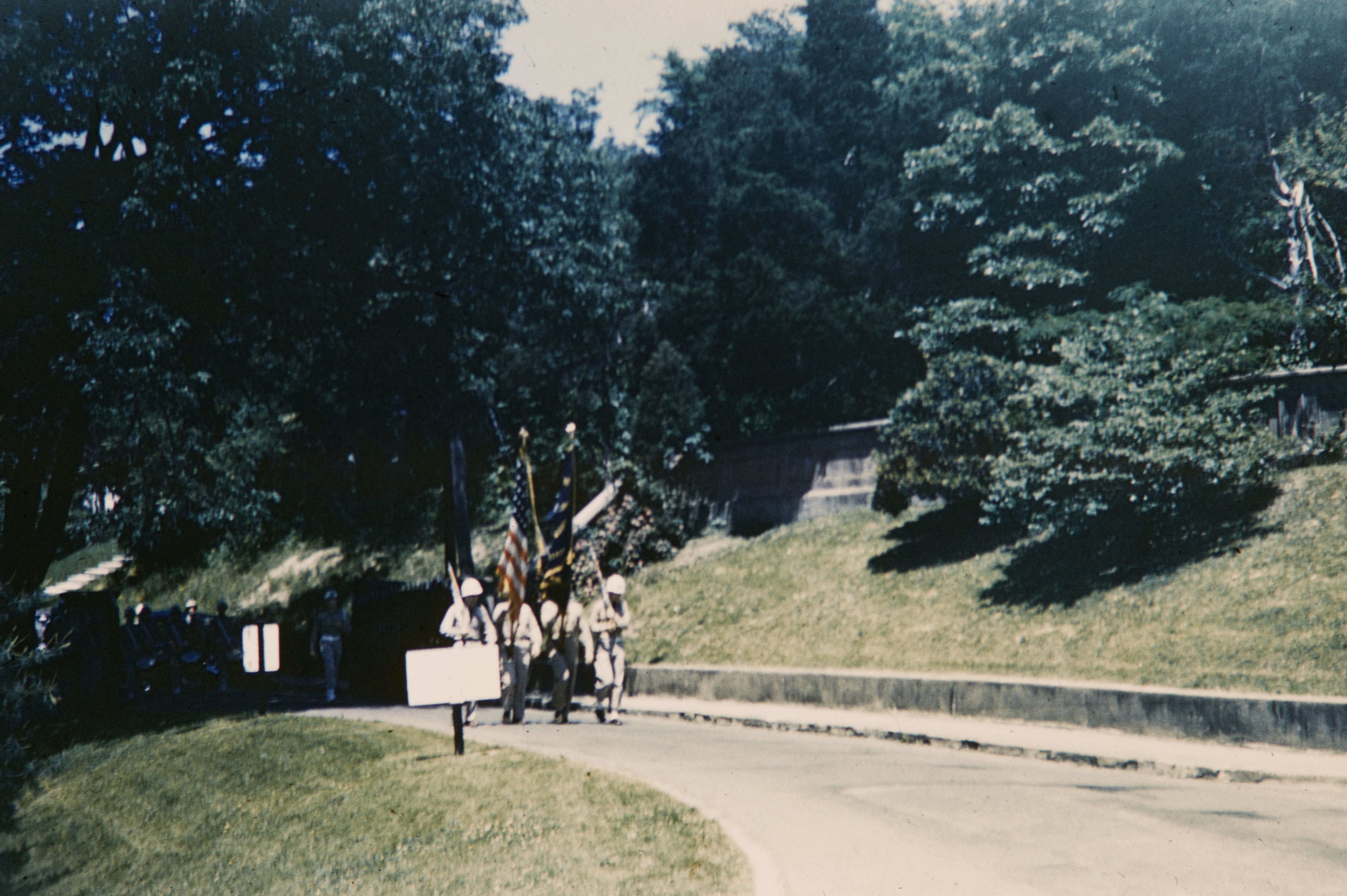 Military band playing in formation through a cemetary in Andrew Johnson National Historic Site.