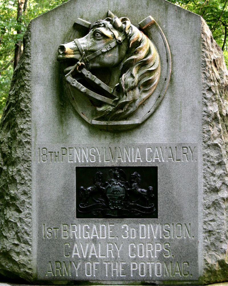 1 of 110 mns in Park honoring PA commands in Gettysburg Campaign. Marks position of 18 PA Cavalry on July 3, 1863 prior to its charge on Confederate infantry men at Bushman Farm. Located at S end of Park, S of Confederate Ave. || MN & 2 Flank Markers. Rough-hewn base, 7'x5', shaft, 5'x2'6", 8'6" high. gable top. Inscriptions in polished panels on E/W. High relief of horse's head & shoe, bronze state seal on E. Carved Corps insignia on W. Flank Markers, 1'x1'x1'6".