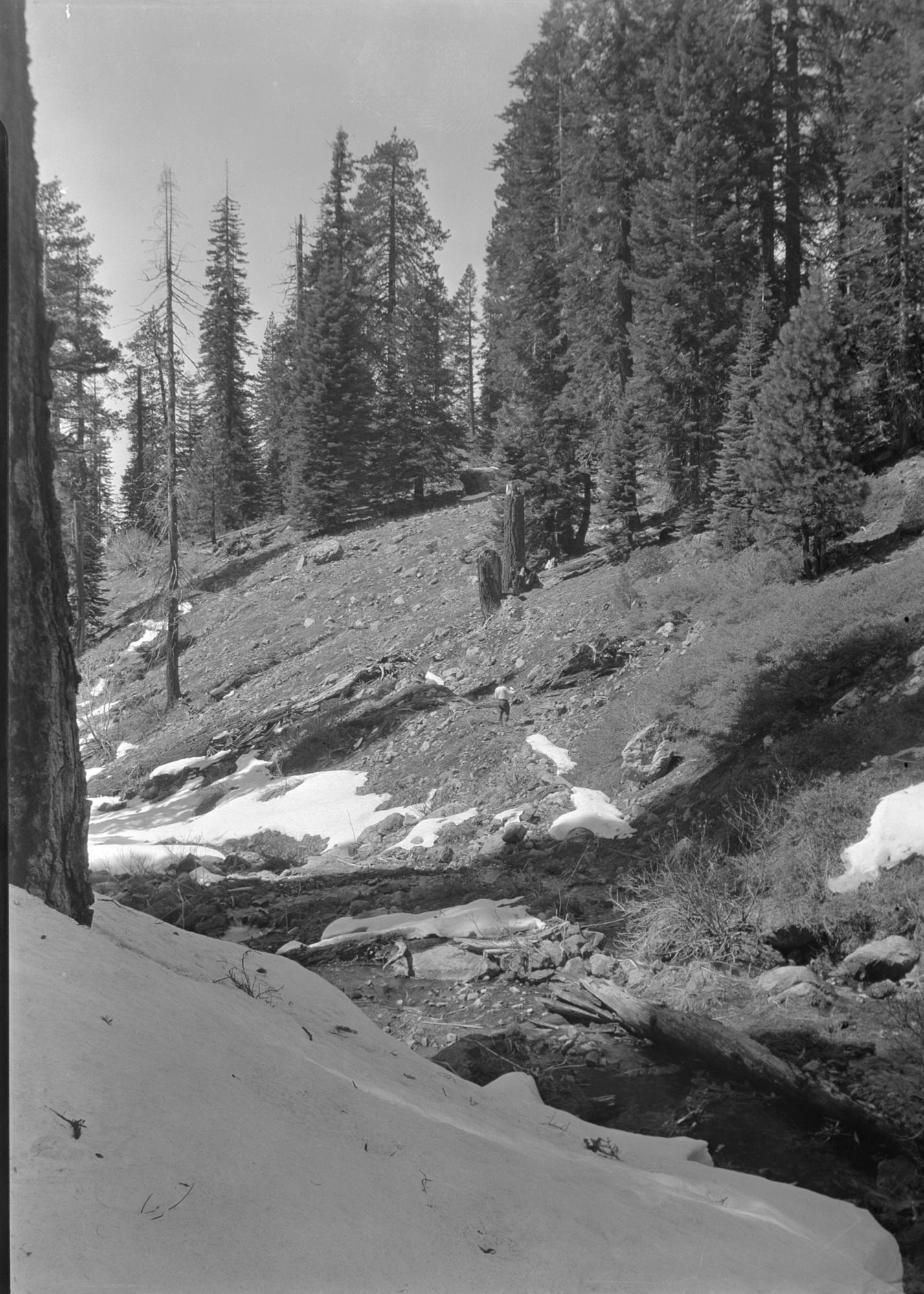 Writing found on back of photo: "Alders brilliant in sunshine on the South Fork of the Tuolumne River. Soon another foot - log will span the stream - another convenience for fishermen."