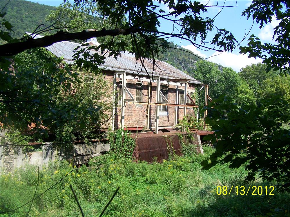 The photograph views of the historic Hydroelectric Plant building on August 13, 2012, show the deteriorating exterior conditions - i.e. vegetation overgrowth, rusting chain link fence, rusting sheet metal roof, broken windows, paint failures, and water intrusions - which justify the project stabilzation work; Harpers Ferry National Historical Park/NPS. This building is located in Lower Town, at the east end of hte historic Potomac Canal, along the Potomac River.