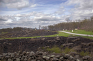 A low stone wall, then a boulder strewn blackened area, then a strip of green grass, then another boulder strewn blackened area in the distance. Along the right is a road with another section of green grass and multiple monuments in front of a tree line.