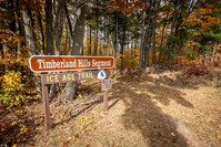 Photograph of brown "Timberland Hills Segment" sign in front of autumn forest.