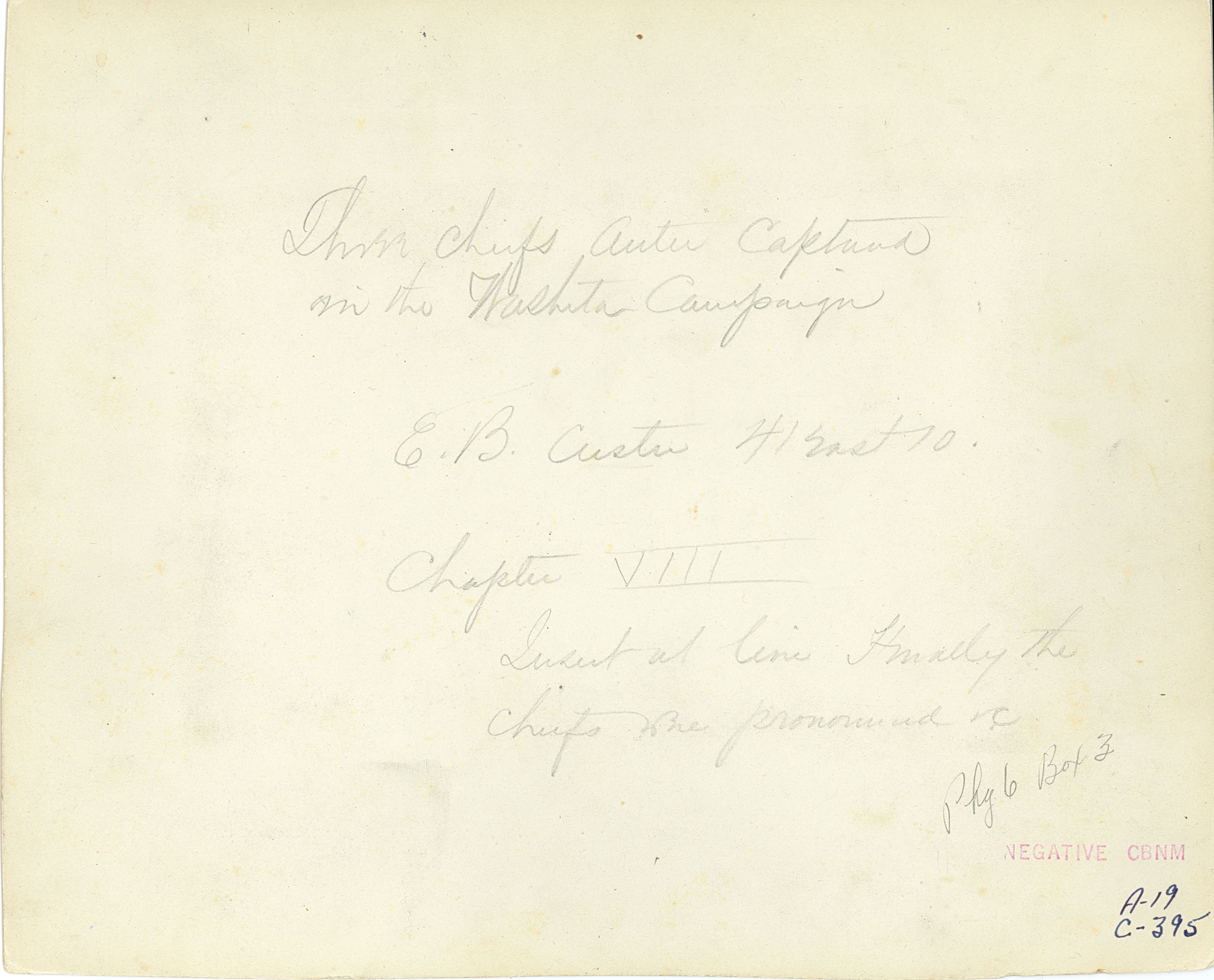 LIBI_00019_00395; This item is an original albumen photograph of 3 Cheyenne Indian chiefs (Fat Bear, Big Head and Dull Knife) captured at the Battle of Washita. Dull Knife was not at the Battle of Washita. The photograph is 4 3/4 x 7" (8 x 9 7/8" mounted) and was produced circa 1869 by W. S. Soule. The image is believed to have been taken at Camp (Fort) Supply, Indian Territory. On the front, a notation in Captain Frederick Benteen's handwriting reads, "Fat Bear/Big Head/Dull Knife/Cheyenne prisoners captured by 7th Cav--Comd. by..." The remaining text has been cut off. On the verso, a handwritten notation in pencil reads, "Three chiefs Autie captured in the Washita Campaign" and is signed by Elizabeth B. Custer.Note: "Pkg 6 Box 3" handwritten on the verso. Photograph reprinted in "The Custer Album" by Lawrence A. Frost, page 104.; Print, Photographic [Mounted on Card]; Courtesy of the National Park Service, Little Bighorn Battlefield National M