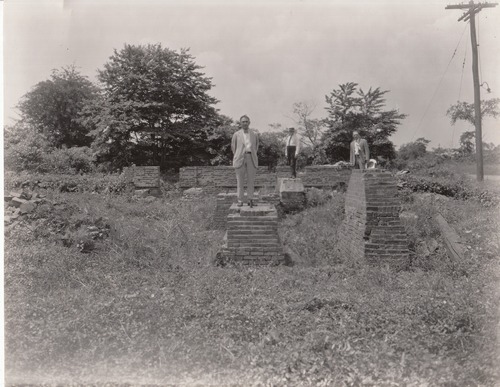 No. 3 engine room at Menlo Park site; Mr. Bishop on main bearing of large engine; Mr. Henry A. Campbell on foundation of original engine and dynamo; Mr. Bennett on chimney foundation.
