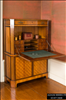 SECRETARY. DETACHABLE DEMILUNE ENDS. LOUIS XVI MARQUETRY FALL FRONT DESK WITH FRUITWOOD INLAY IN THE FORM OF QUATRE-FOIL AND OTHER GEOMETRIC DESIGNS. TOP LONG DRAWER WITH ORIGINAL BRASS PULLS, OPENING TO A WRITING DESK, THREE SMALL DRAWERS AND THREE SMALL COMPARTMENTS FOR LETTERS AND INK.