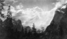 Copied by DC in 1935. Original taken by George Fiske. Clouds over Cathedral Rock. An interesting story is that Mr. Fiske was thrilled upon developing this negative to find the familiar face of a San Francisco friend outlined on the cloud in the center. "Why that is _________" he exclaimed. A few days later, he learned that his friend died the same afternoon the photgraph was taken, and Mr. Fiske always considered this a spirit photo.