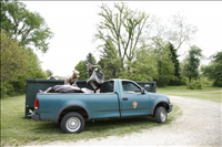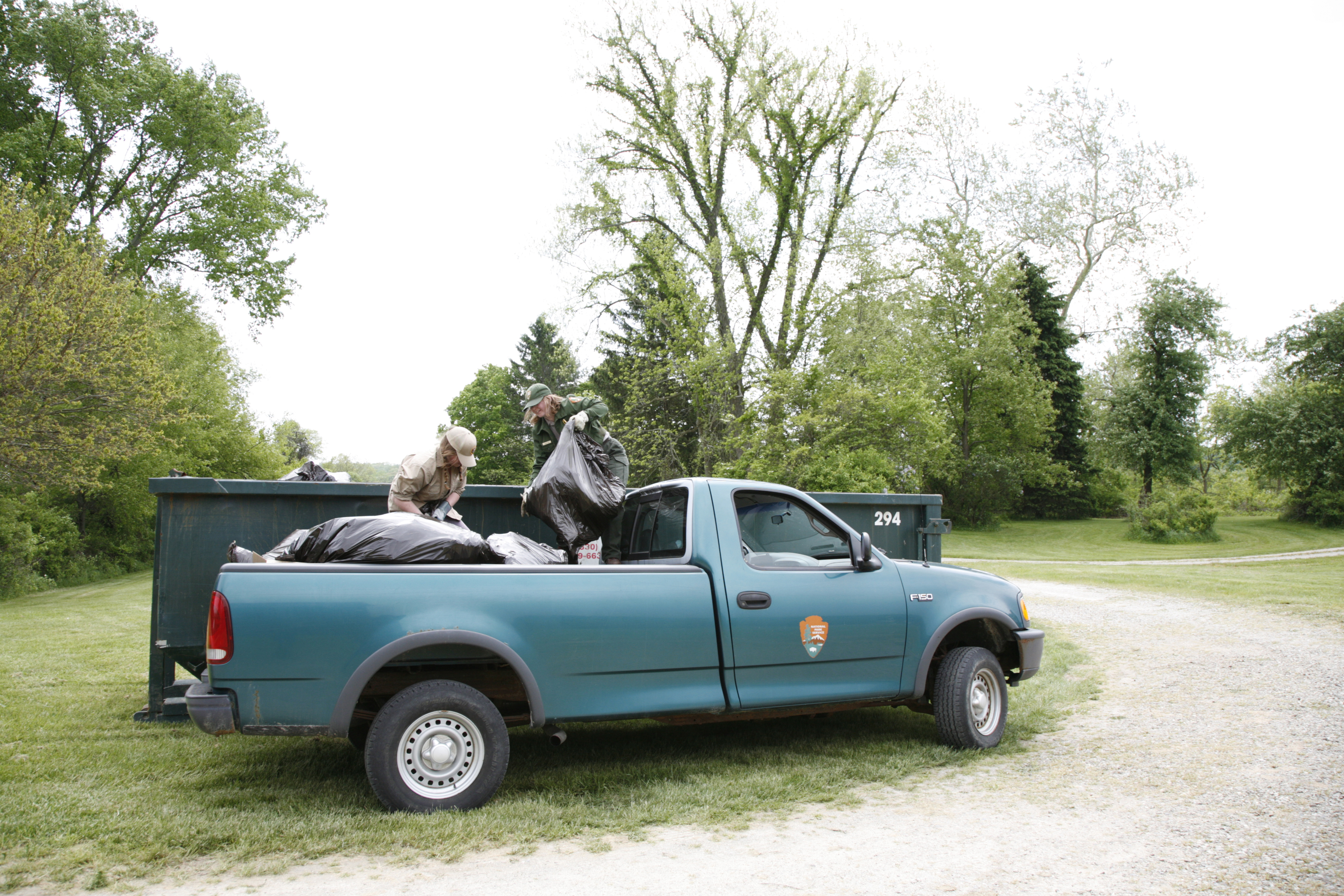 An SCA intern and NPS Botanist Laura Elze dispose of bags of invasive plants at River Day 2007 || Invasive plants are exotic species that tend to crow out native plants. Cuyahoga Valley National Park (CVNP) controls invasive plants when their presence menaces natural conditions. Volunteers hand pull small, easily controllable populations.