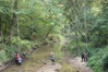5 people, 2 on each pole and 1 in the middle, working to assemble a tall net that spans the width of a creek surrounded by thick forest.