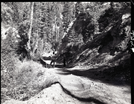 Dirt road from Potato Hollow to Kolob Creek with a small green fir tree uprooted and pushed off road. ; ZION Museum and Archives Image 101_02_003 ; ZION 8291