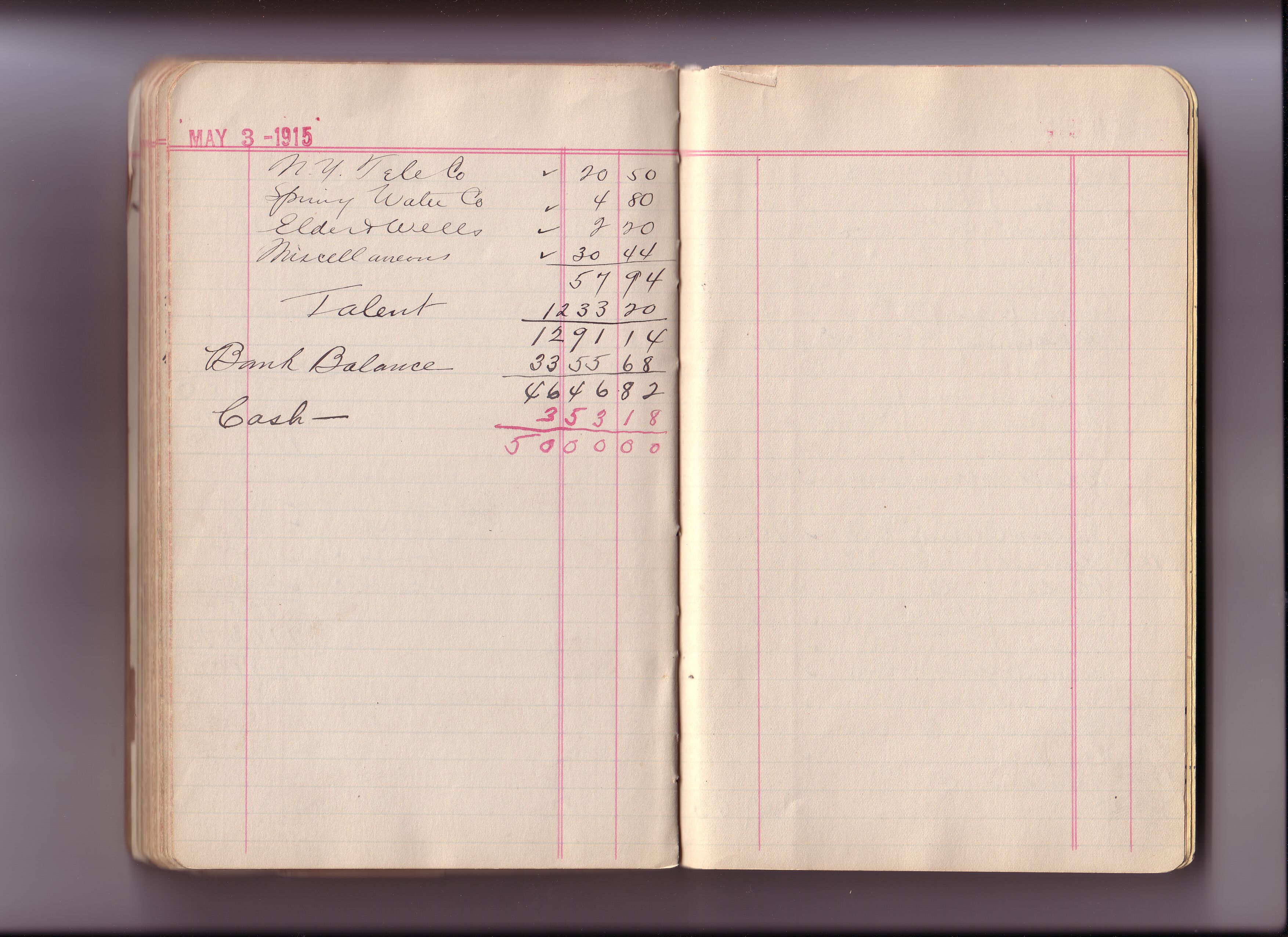 Thomas Edison's New York City Recording Studio Cash Book 11 (of 21), Image 85 (of 89). (Notebook #: PN-14-04-27, NPS catalog #: EDIS 1422), This book documents Diamond Disc matrices 2979 – 3791, expenditures for recording artist fees and other payments authorized by studio manager Walter H. Miller from April 27, 1914 – May 15, 1915. Digitally scanned December 2004 through July 2005 at resolution 300 dpi, 24 bit.
