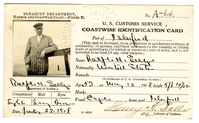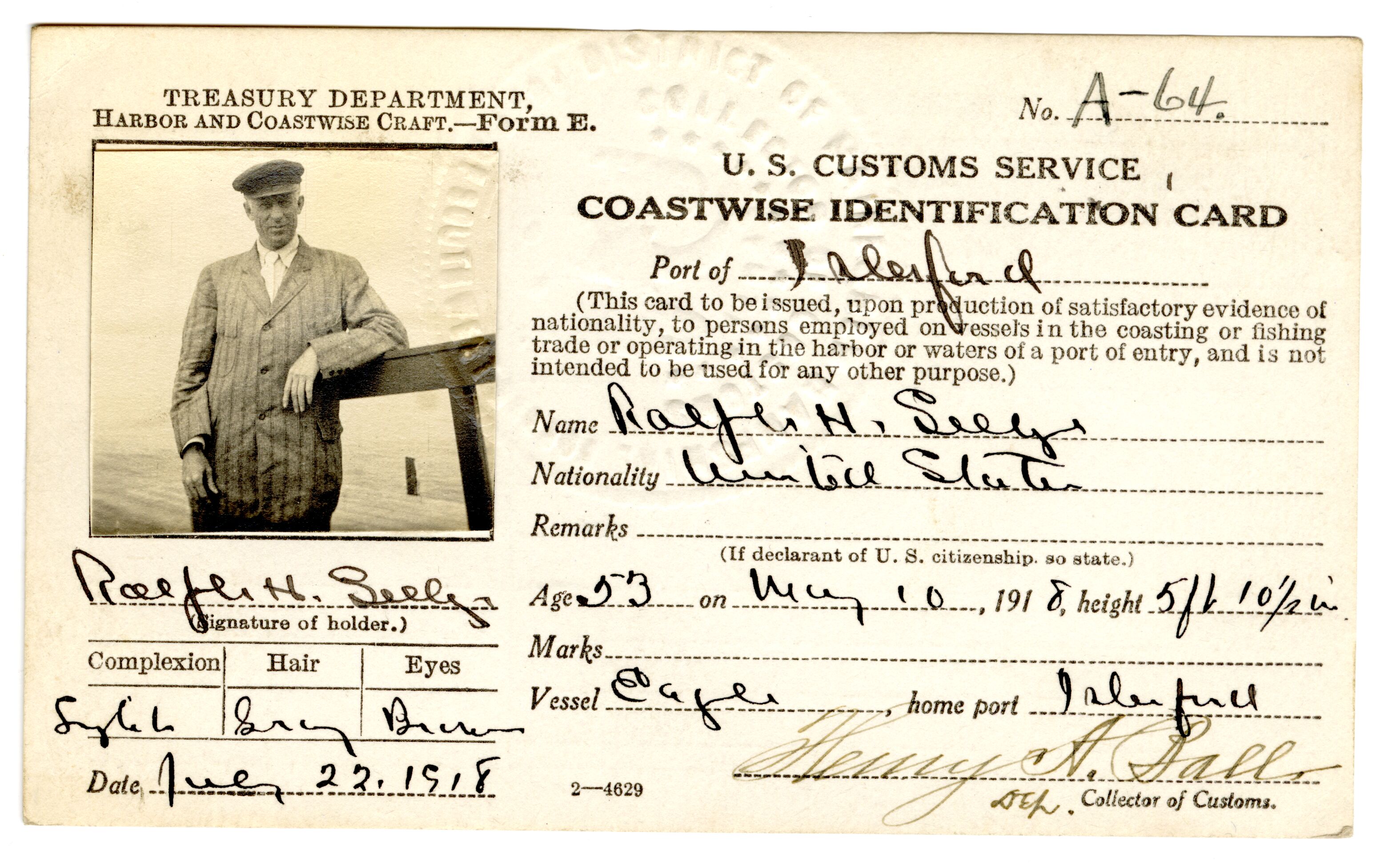 Coastwise identification card for Ralph H. Seely. Card was issued at the Port of Islesford, Maine. His age was 53 as of May 10, 1918. His ship/vessel was named the Eagle and its home port was Islesford, Maine. The photograph adhered to the card shows the person dressed in a suit and tie. Seal embossed on card reads, District of Maine & New Hampshire, Collector of Customs, Deputy, Port of Southwest Harbor, Maine. Nationality listed as American.