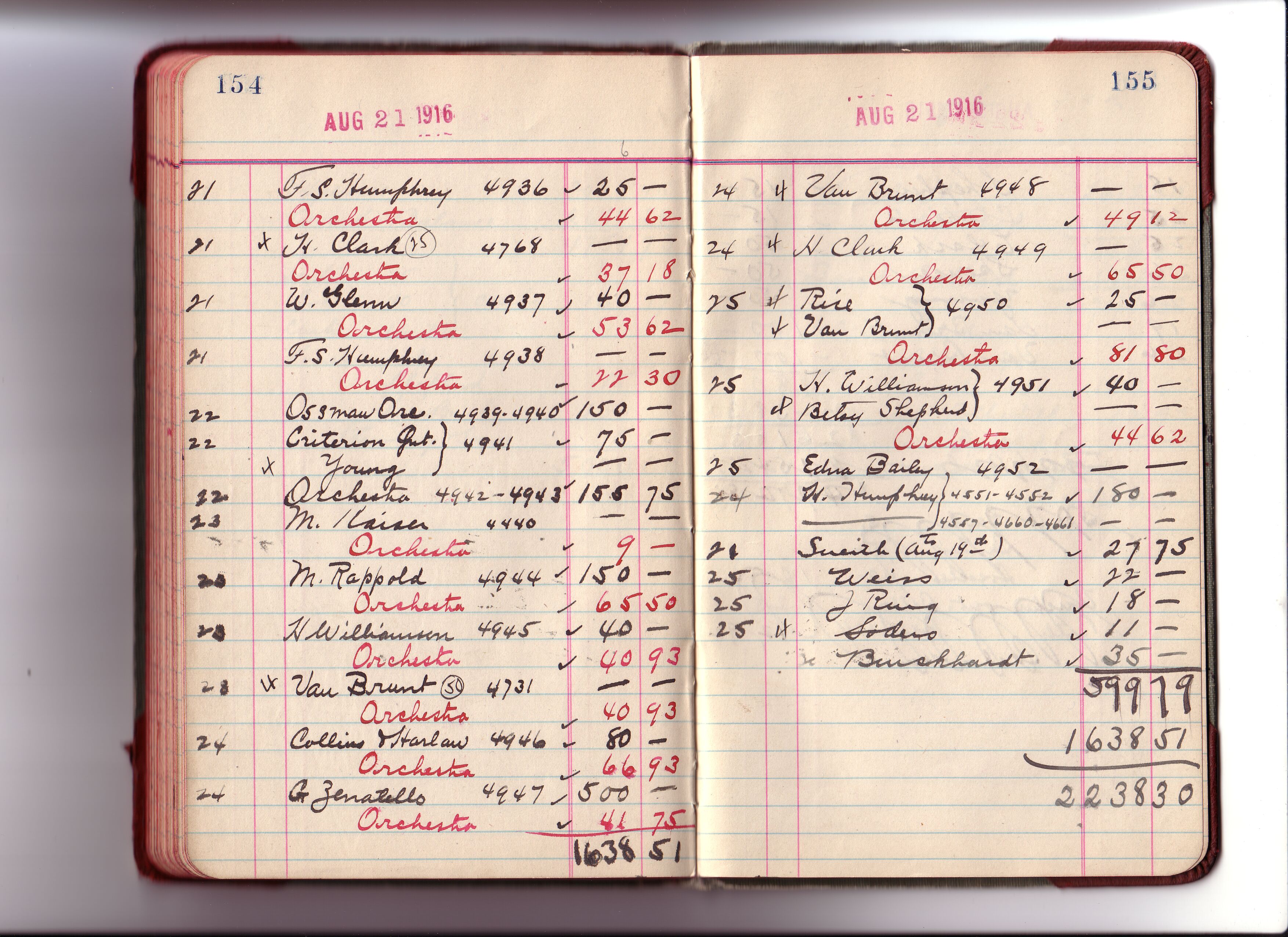 Thomas Edison's New York City Recording Studio Cash Book 13 (of 21), Image 67 (of 80). (Notebook #: PN-16-01-03, NPS catalog #: EDIS 1424), This book documents Diamond Disc matrices 4389 – 5030, expenditures for recording artist fees and other payments authorized by studio manager Walter H. Miller from January 03, 1916 – September 30, 1916. Digitally scanned December 2004 through July 2005 at resolution 300 dpi, 24 bit.