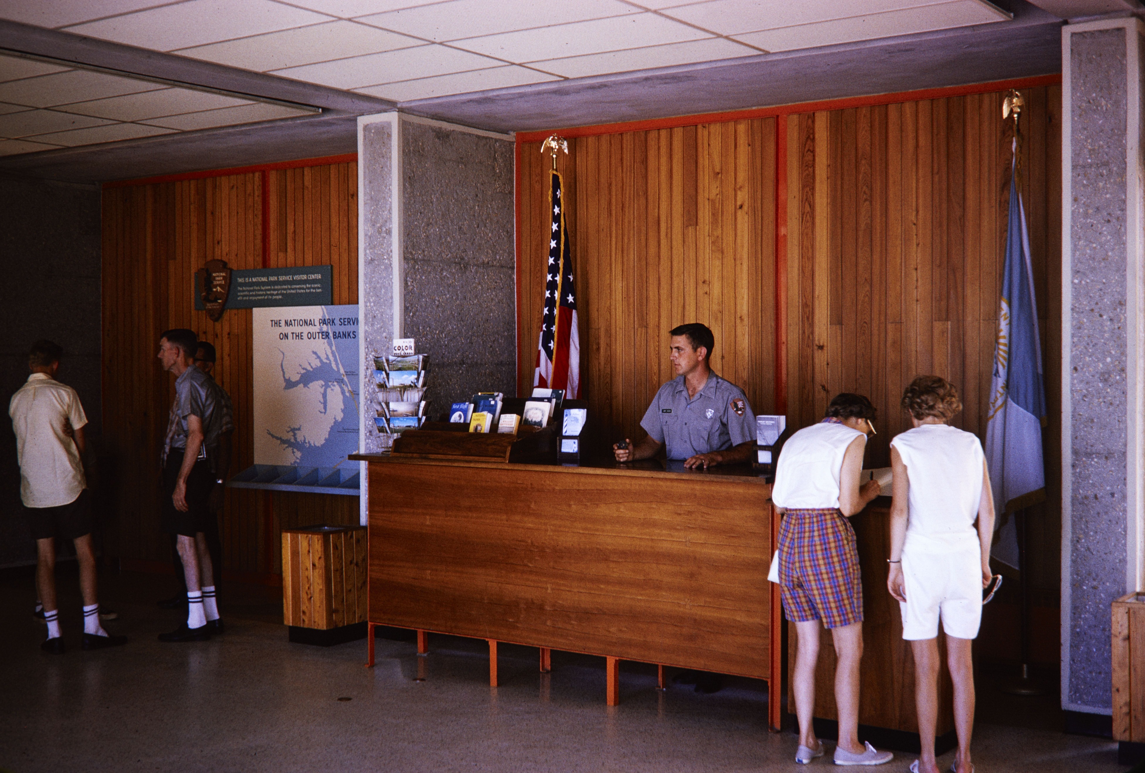 NPS employee, Jerry Calhoun, in uniform behind the information desk at the visitor center in Wright Brothers National Memorial.