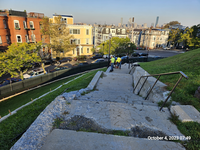 A crumbling concrete stairwell going downhill from the perspective of the photograph leads to a street with a myriad of row homes on the other side. Workers in high visibility attire study the concrete at the bottom of stairs.