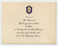 An invitation to an event in honor of Mrs. Roosevelt from the Congressional Club at Home to Bess Truman. The invitation has an embossed seal at the top.