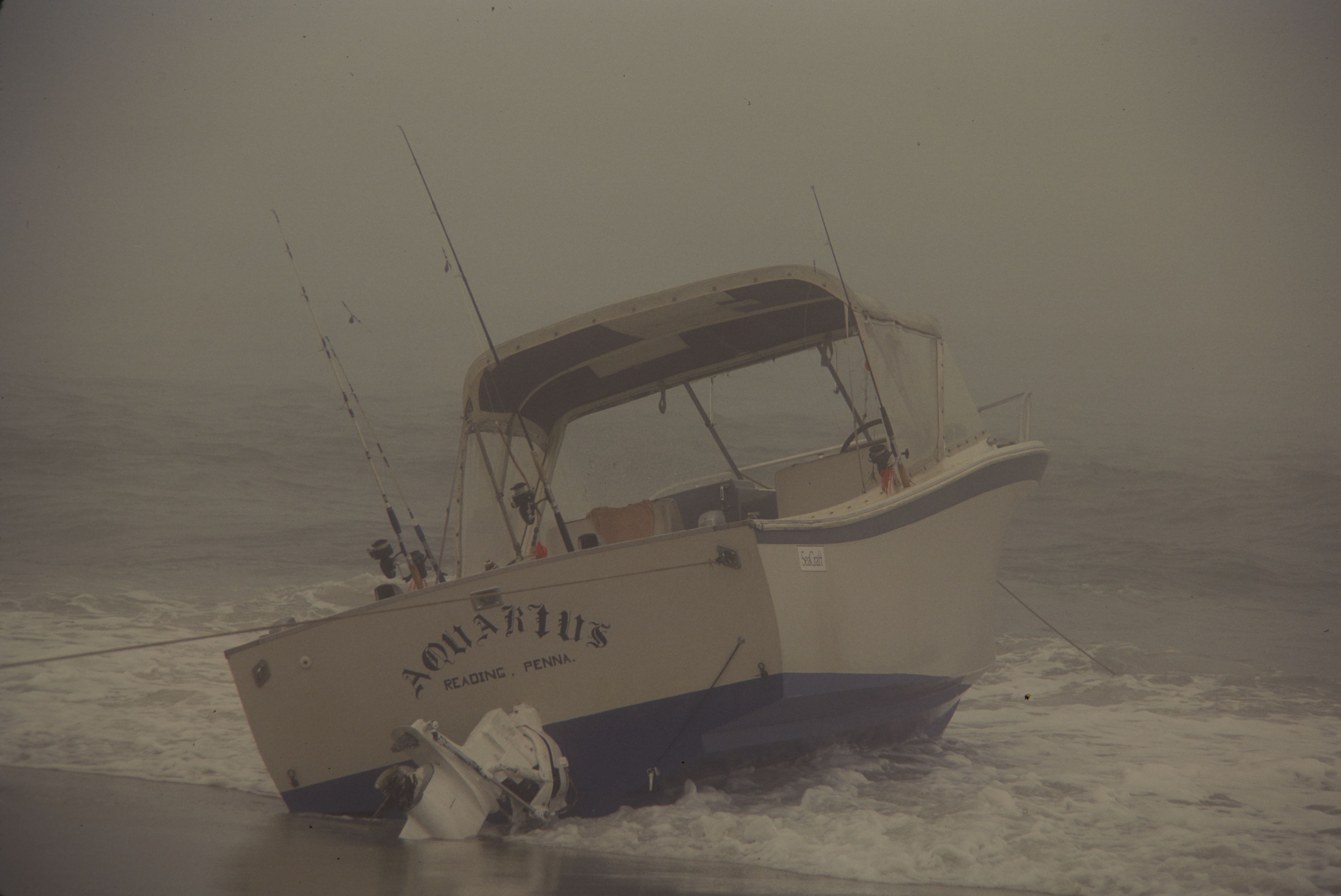 Beached boat in fog on north end of the Assateague Island National Seashore.