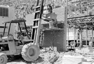 Worker adding bricks to brick wall during construction of headquarters addition. ; ZION Museum and Archives Image 004.01.04-105of352 ; ZION 15933
