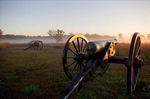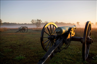 Foggy sunrise over cannons, Manassas National Battlefield Park, 2014.