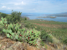 Large green pricklypear paddles with red fruits on hill overlooking a lake.