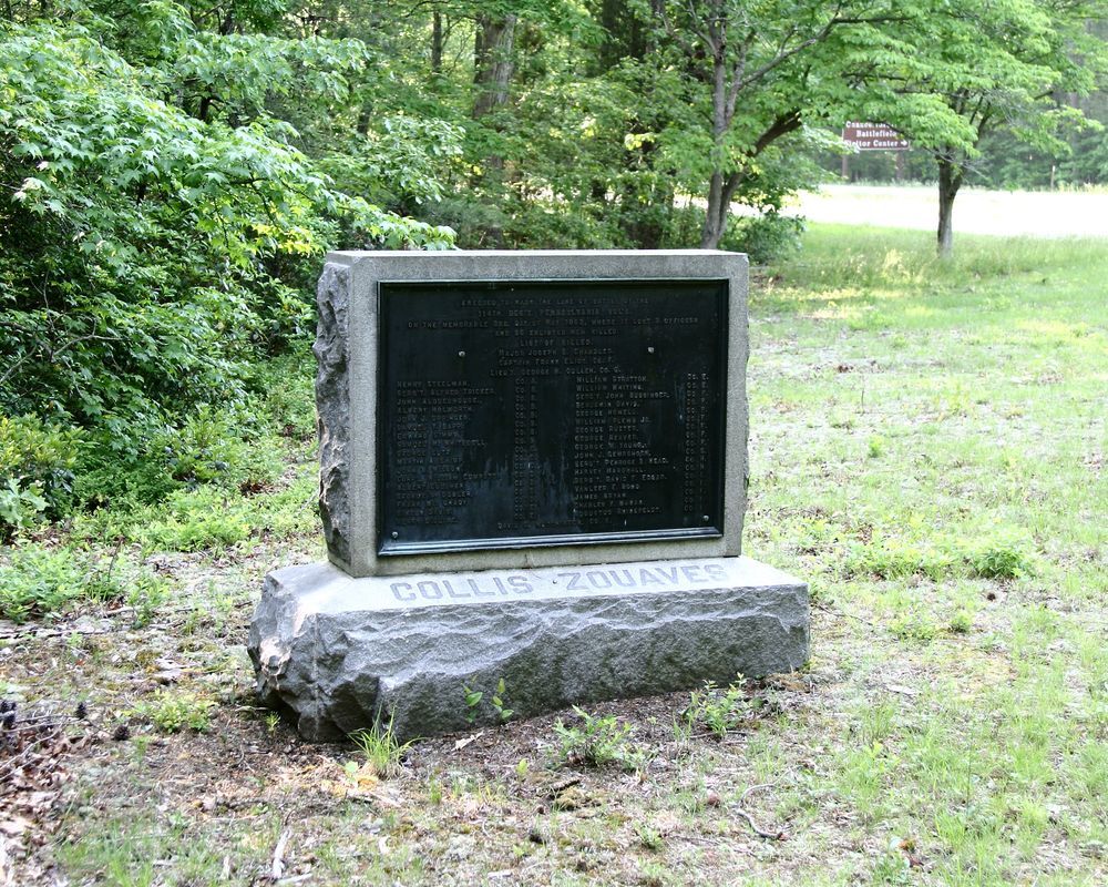 A Zouave regiment under the command of General Collis. Monument marks position held by the 114th Pennsylvania during the Battle of Chancellorsville, May 3, 1863. Monument erected by Cartwright & Davis. || 2 part monument. Rough-cut base, 2'3"Wx5'4"Lx12"H w/ 7" tooled chamferred edge & raised inscriptions. Monolithic, rough-cut shaft w/ tooled edges, 1'Wx4'Lx3'H. Bronze plaque, 2'7"Hx3'7"L, w/ raised inscription on west face.