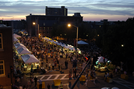 An aerial shot of a street full of people looking at various food tents during the Lowell Folk Festival