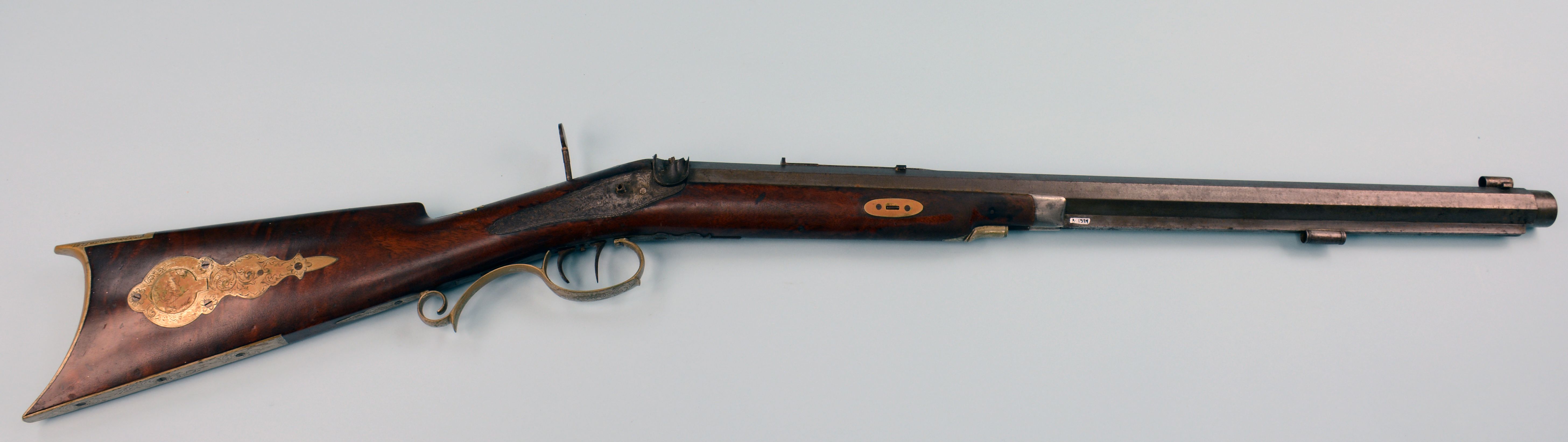 RIFLE, STAMPED J. BROWN, FREMONT N.H. CAST STEEL. ON TOP OF BARREL WHICH OS OCTAGONAL. PERCUSSION CAP, HAMMER MISSING, PEEP SIGHT. STAY HEAD IN SILVER SET ON TOP OF BUTT SAYS "EDWIN HADLOCK". HAMMER PLATE DECORATED WITH WILD GEESE.BARREL 26 1/2 IN. OVERALL 43 IN. BORE ABOUT 3/8.
