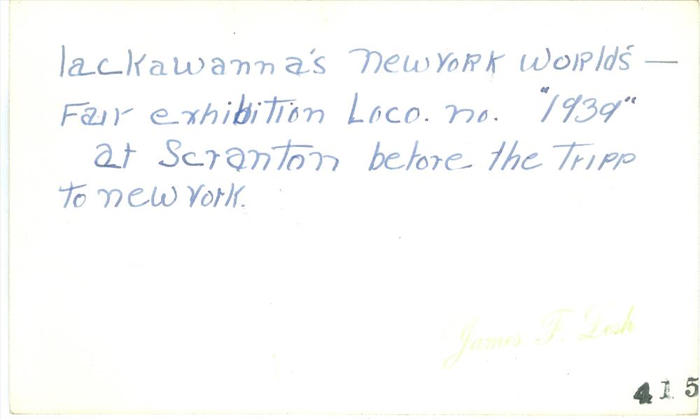 Caption: Lackawannas New York Worlds Fair exhibition Loco. No. 1939 at Scranton before the tripp [sic] to New York